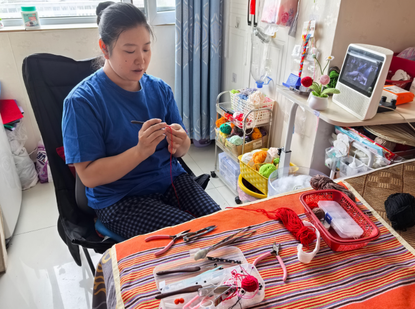 如今,梁娟的床头摆着非遗证书考试复习资料,她希望让钩织手艺得到更好传承。两年间,她已教会十多位居民钩织技艺,帮助大家靠手艺增加了收入,而她自己的病情也奇迹般稳定下来。