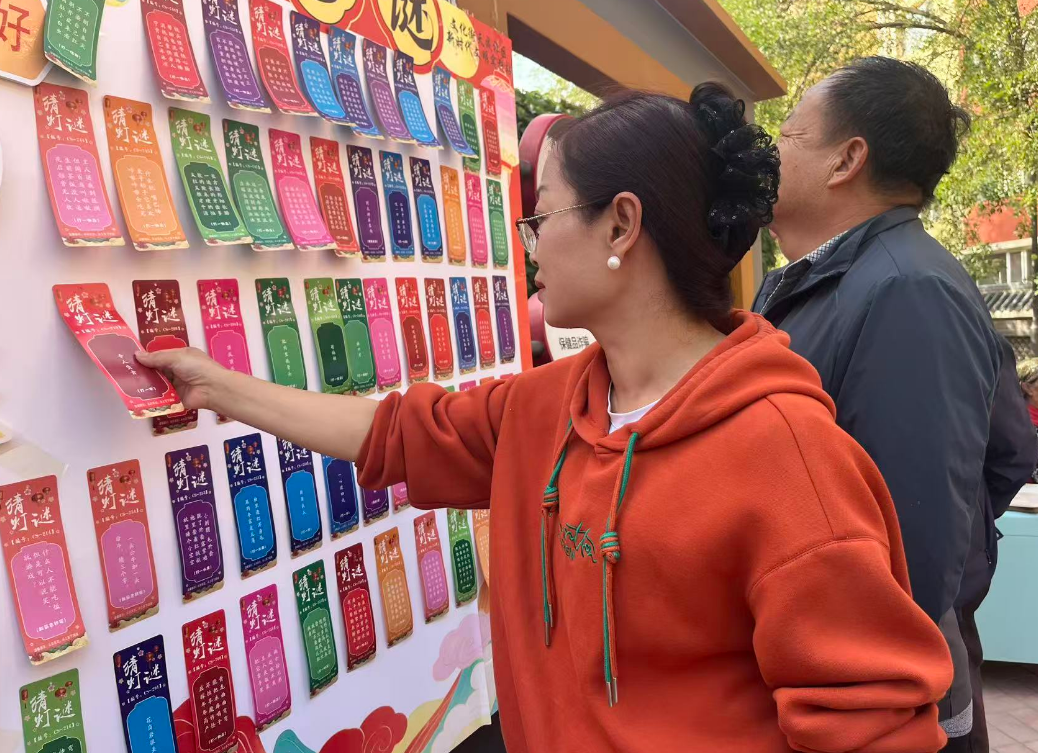 猜灯谜区域化身“月宫谜阵”,条灯谜悬挂在红灯笼下,涵盖历史典故、生活常识等内容。大家结伴思考、协作解谜,成功猜中者即可兑换小礼品。现场同步开展“双节便民服务集市”,健康义诊团队为居民免费测量血压、提供养生建议;助农摊位上,来自周边乡镇的玉米、小黄瓜等时令蔬菜热销;磨刀师傅的摊位前,居民们排队等待刀具焕然一新。
