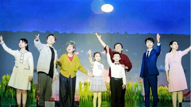 《黄河轻柔地流过》《籽籽同心 照亮梦想》等节目通过朗诵、演诵、视频、舞蹈等多样形式交替呈现。演员们或激昂或深情地朗诵着,声音时而如黄河水奔腾咆哮,时而如潺潺溪流婉转悠扬,既传递出中华文明“重民生、守根基”的深厚传统,更生动展现新时代宁夏儿女真抓实干、锐意创新的奋进姿态。此外,诗会还邀请援宁工作队员、闽宁本土艺术家通过《山海的中秋》《家乡的中秋》视频向福建的亲人及全县的百姓们送上中秋祝福,闽宁镇返乡青年现场与大家分享新时期“山海”故事。演员们以真挚的情感、鲜活的表达,将各民族群众血脉相连的赤子之心展现得淋漓尽致。