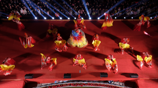 民乐演奏《象王行》中,以“象”为意象,形成主舞台与玉皇阁上器乐对奏格局,融合传统民乐与现代视听技术,以“声音之鼎”传递历史厚重的盛世气象,鸣响时代文化复兴强音。舞蹈《丝路飞天》从石窟中引来飞绸舞,以蹁跹舞姿话千年历史。诗词朗诵《将进酒》《醉翁亭记》则将中秋赏月、观潮、燃灯的传统风俗融入诗情画意之景中,赏古诗中的明月,品文化中的佳肴。