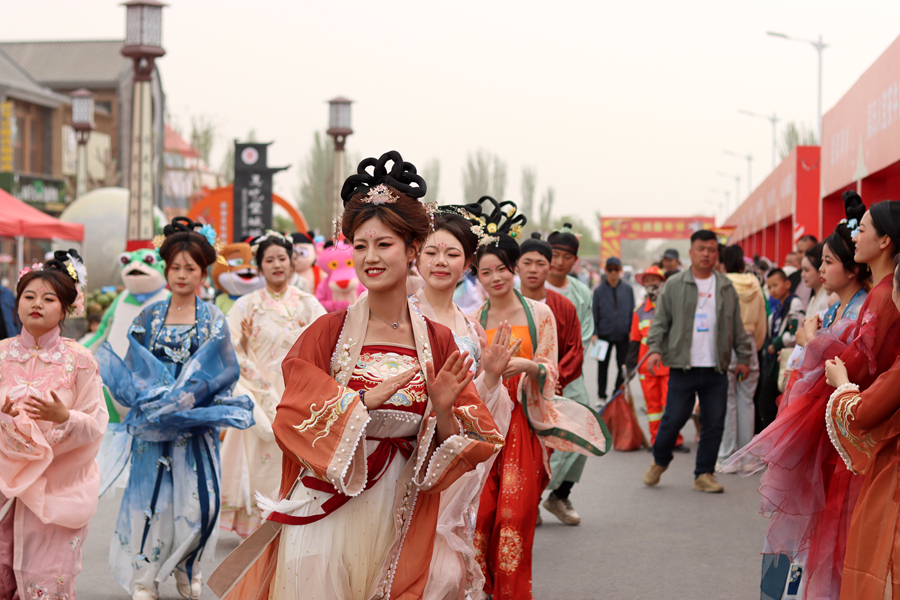 第五届吴忠早茶美食文化节活动主会场——牛家坊民俗文化村,在整个假期仿佛被按下“沸腾键”,吴吃堡城飘出的拉面香勾起了游客的食欲,百米美食街上,一米肉串、炸夹板等特色小吃摊位前排起长龙,舞台上秦腔表演等节目轮番上演,NPC巡游更是让孩子们追着跑。
